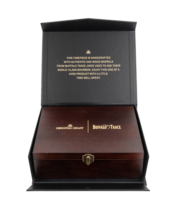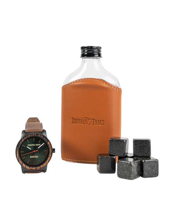 Discover this one-of-a-kind leather watch crafted from reclaimed Buffalo Trace bourbon barrels with a hand-torched finish. Handcrafted in the USA and complete with a glass flask and whiskey rocks for the perfect tasting experience.