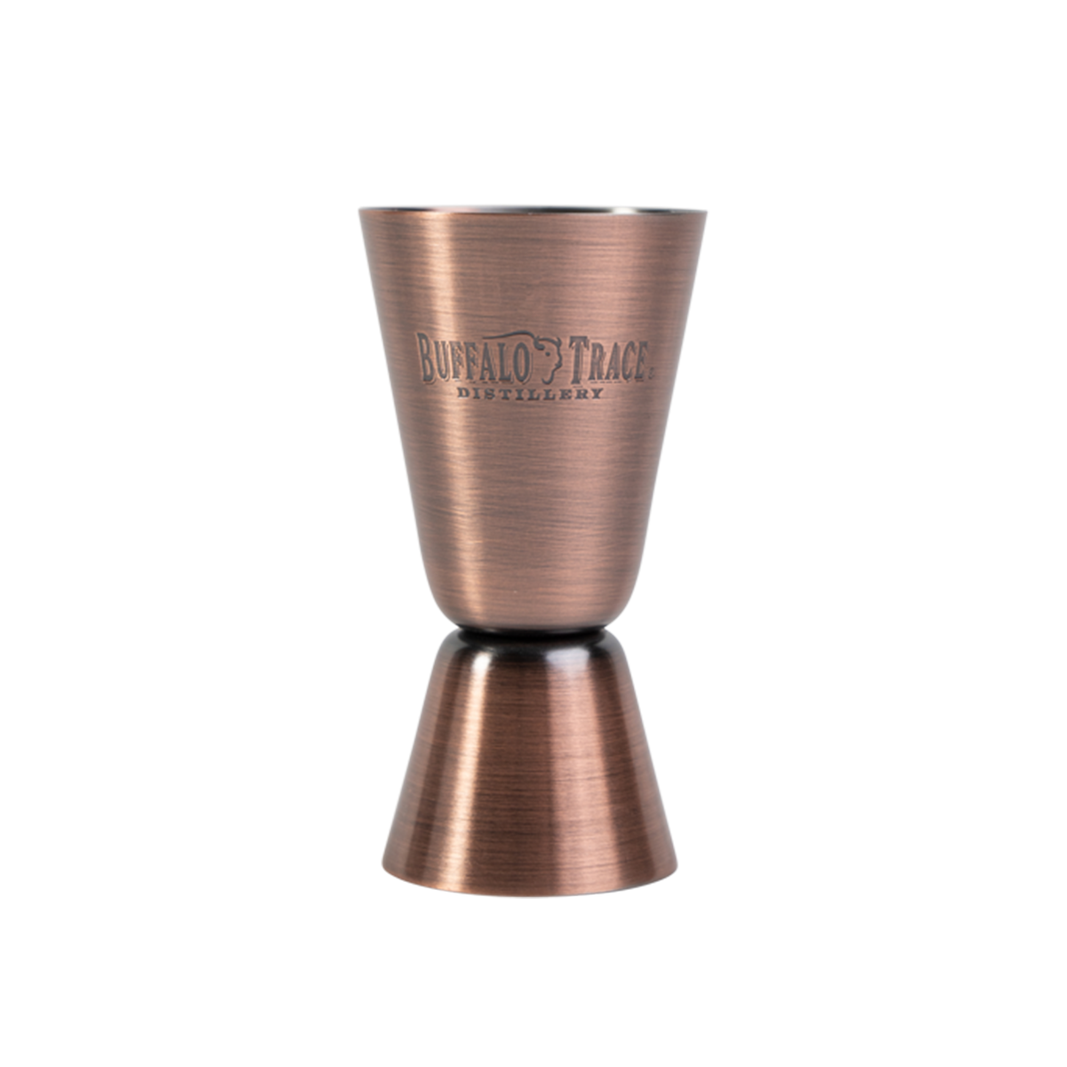 High-quality engraved copper jigger from Buffalo Trace for precise cocktail measurements. Perfect for bartenders and home mixologists.