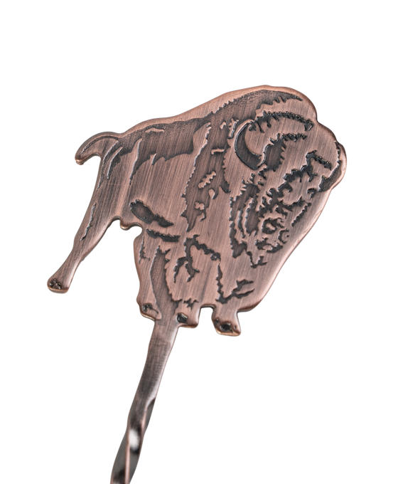Elevate your cocktail game with the Buffalo Trace Copper Mixing Spoon, featuring a buffalo-topped handle and a precision-turned stir rod.