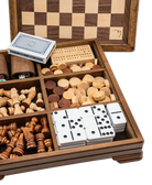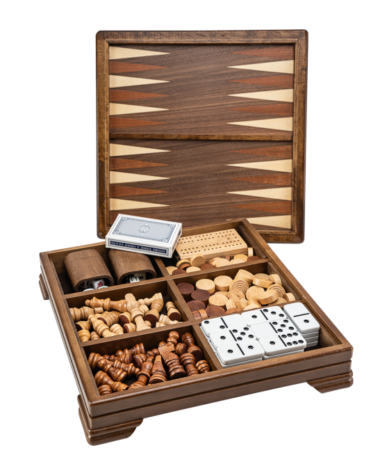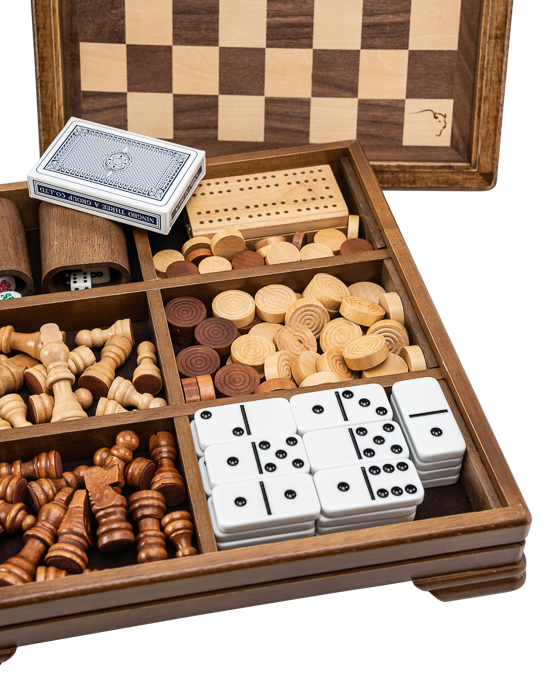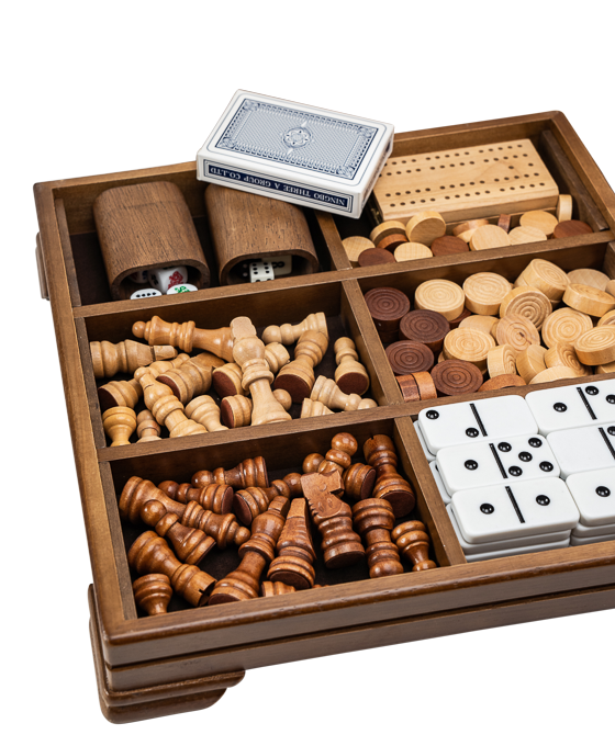 - Multi-Game Set: Chess, Checkers, Backgammon, Dominoes, Cribbage, Poker & Dice