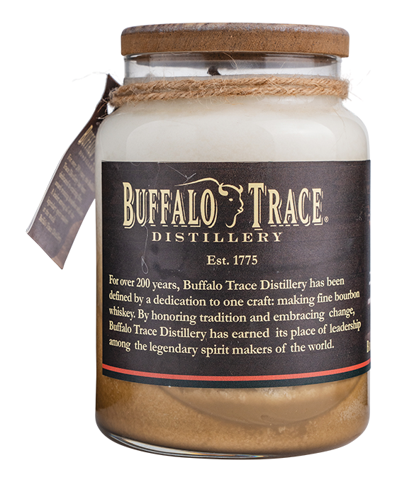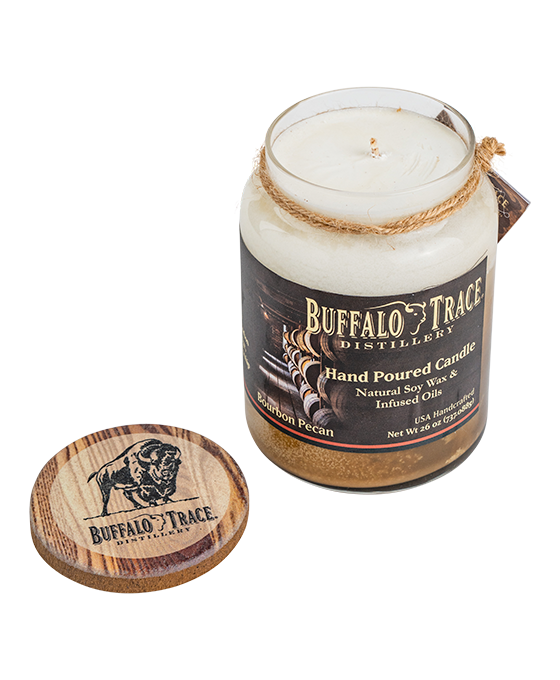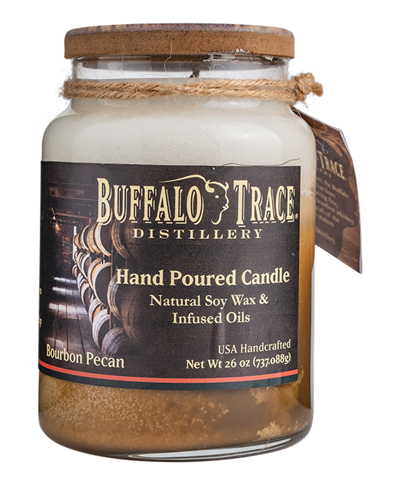Buffalo Trace Distillery 26oz Bourbon Pecan Scented Candles throw fresh aromatic fragrances throughout the entire burn of the candle.  Each candle is 100% USA natural soy wax with a cotton-braided wick that contains no lead nor zinc, providing a clean burn throughout.