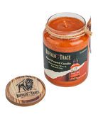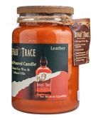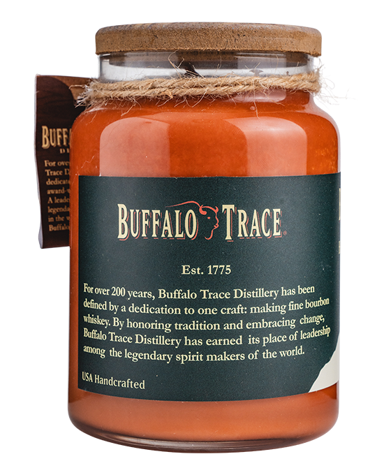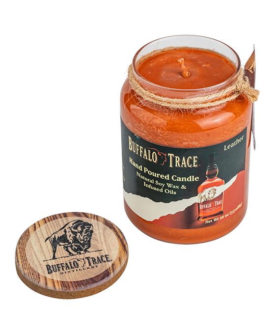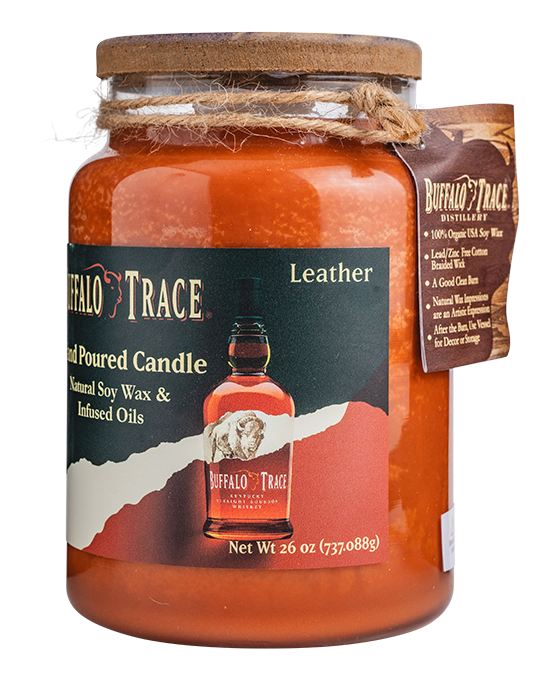 Buffalo Trace Leather Scented Candle in a 26oz glass jar with lid, handcrafted in the USA using 100% natural soy wax and a cotton-braided wick for a clean burn.