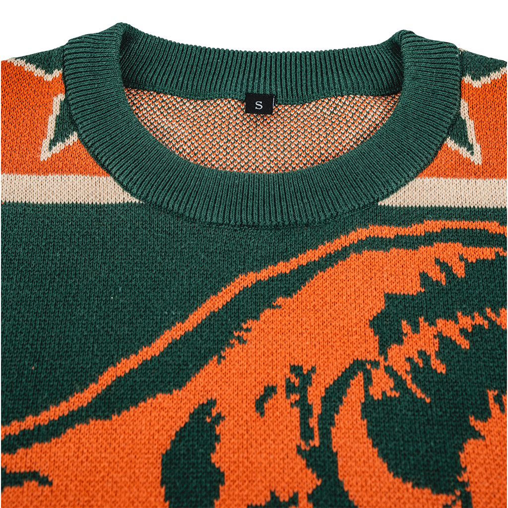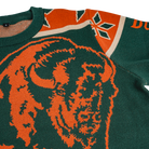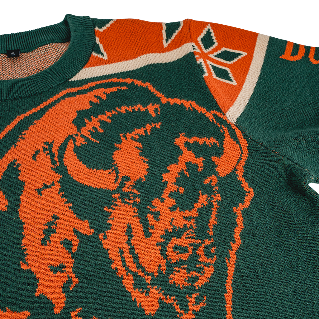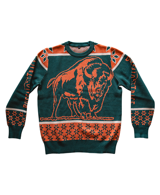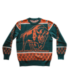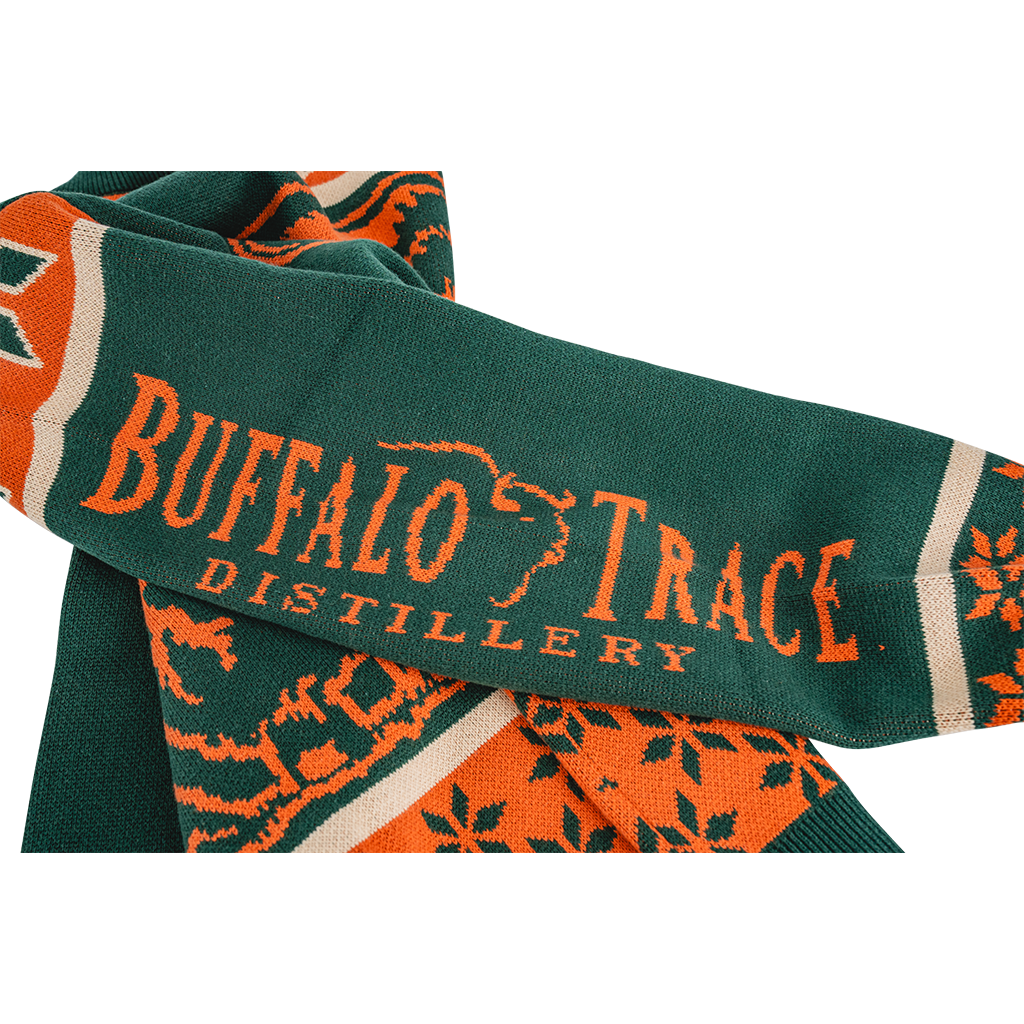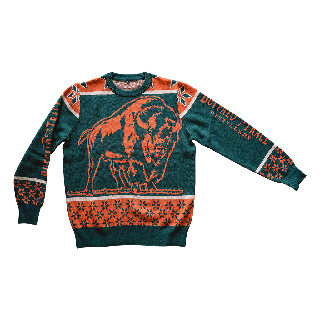 Celebrate the season in style with this distinctive Buffalo Trace Holiday Sweater featuring an eye-catching buffalo motif and traditional Fair Isle-inspired patterns. The heavyweight knit construction in signature Buffalo Trace green provides warmth and comfort for winter festivities, while the contrasting distiller's orange accents create a bold, festive look.