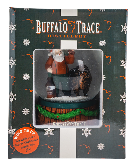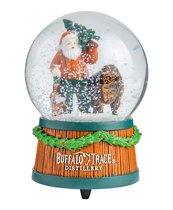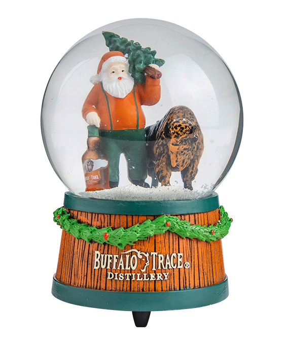 Bring holiday magic to your home with this charming Buffalo Trace Holiday Snow Globe. The festive scene features Santa Claus carrying a Christmas tree alongside a majestic buffalo, surrounded by swirling snow when shaken. The detailed barrel-style base showcases wood grain texturing with green metal bands and holiday garland trim.