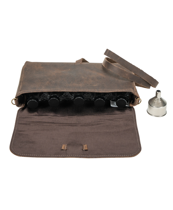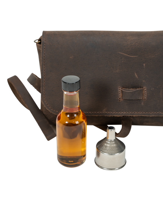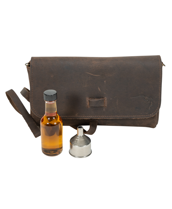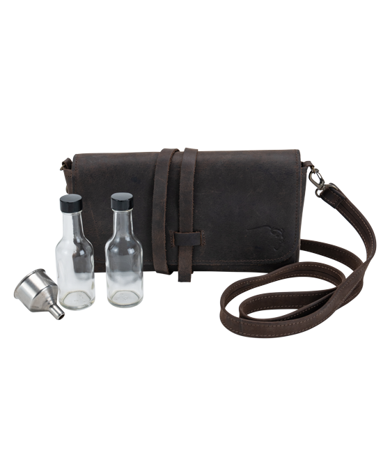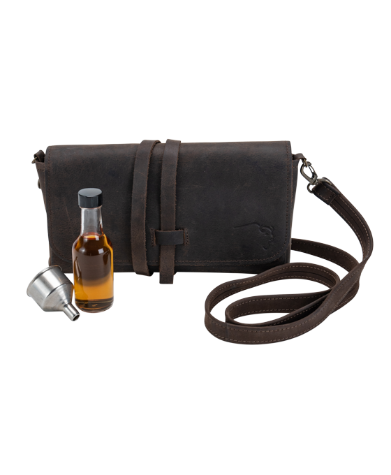 Elevate your travel style with Buffalo Trace’s premium leather crossbody travel bar, featuring a subtle buffalo logo and versatile carrying options.