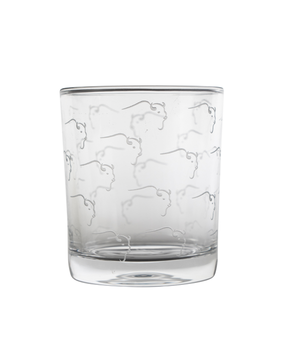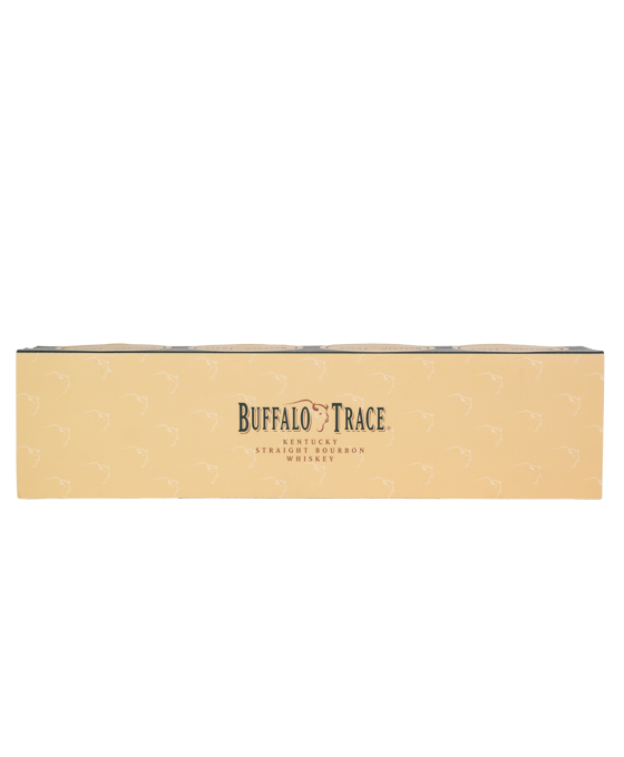 The Buffalo Trace swoosh logo is etched in a repeating pattern around each glass—a mark that represents America's oldest continuously operating distillery. Classic rocks glass with substantial weight in your hand.