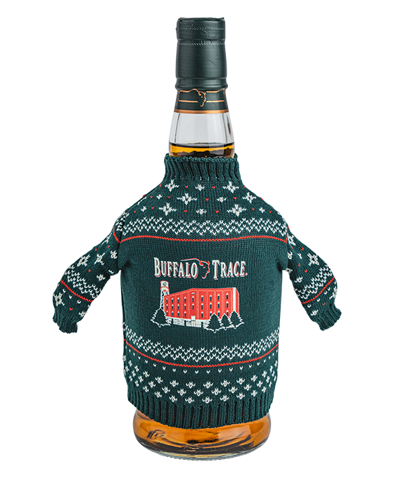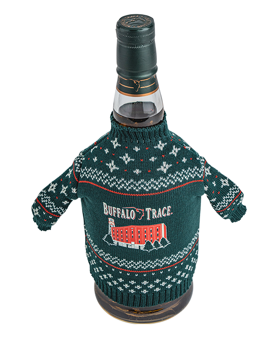 Dress up your favorite bottle of Buffalo Trace with this charming Holiday Bottle Sweater. The miniature sweater features traditional Fair Isle patterns in signature Buffalo Trace green with white snowflake designs and red accent stripes, plus a knitted distillery building design.