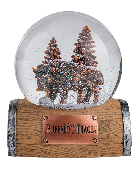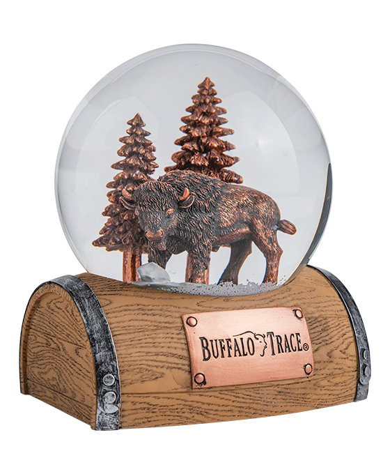 Capture the spirit of the wilderness with this Buffalo Trace Buffalo Snow Globe featuring a majestic buffalo surrounded by evergreen trees in a peaceful winter scene. When shaken, the globe fills with swirling snow that transforms the rustic landscape into a magical winter wonderland.