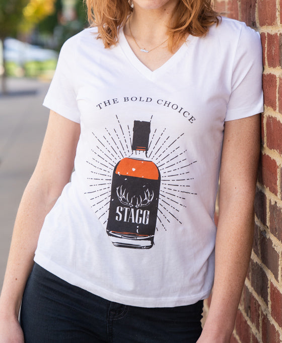 They say 'fortune favors the bold.' We couldn't agree more. In heather white, the triblend t-shirt's bottle-forward design celbrates the bold flavors of our Stagg bourbon. Also available in Ladies' v-neck.