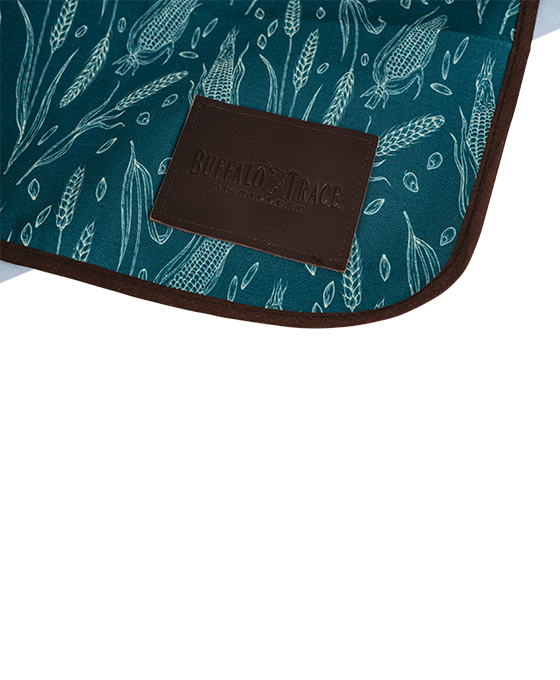 Elevate your backyard cooking with the Buffalo Trace Four Grain Apron in green. Featuring an exclusive four grain print, this apron honors the local grains - corn, rye, wheat, and barley - used in our iconic bourbon recipes. Durable cotton fabric and an adjustable neck strap provide comfort and functionality for every grill master.