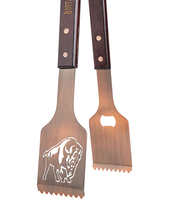 Master your grilling game with these Buffalo Trace Grilling Tongs featuring precision laser-cut buffalo silhouettes and premium copper-finished stainless-steel construction. The ergonomic leather-wrapped handles provide a comfortable grip, while the serrated edges ensure secure handling of all your grilled favorites.