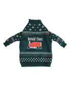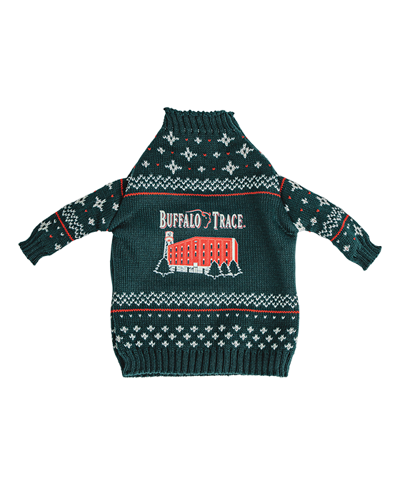 Dress up your favorite bottle of Buffalo Trace with this charming Holiday Bottle Sweater. The miniature sweater features traditional Fair Isle patterns in signature Buffalo Trace green with white snowflake designs and red accent stripes, plus a knitted distillery building design.